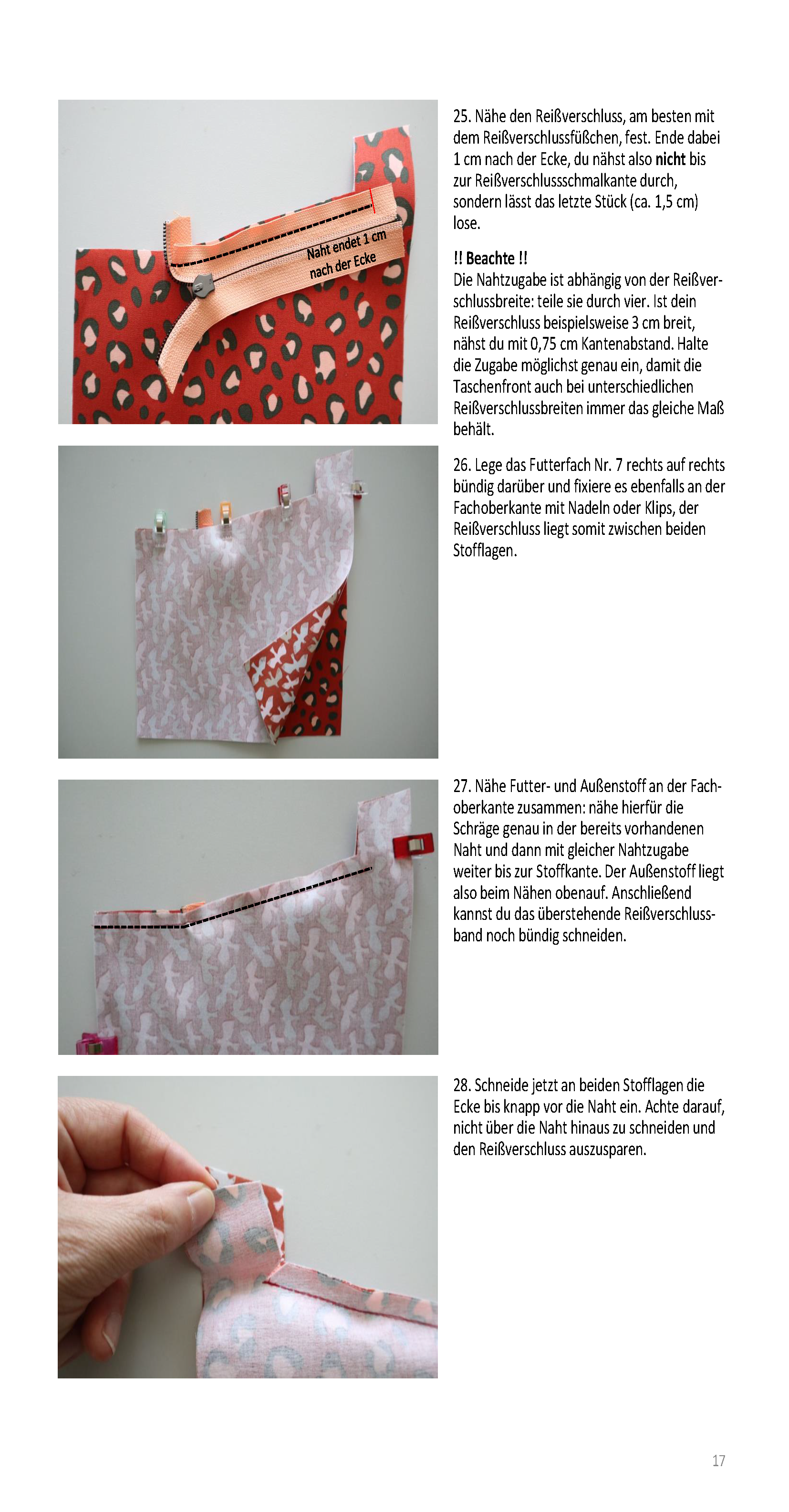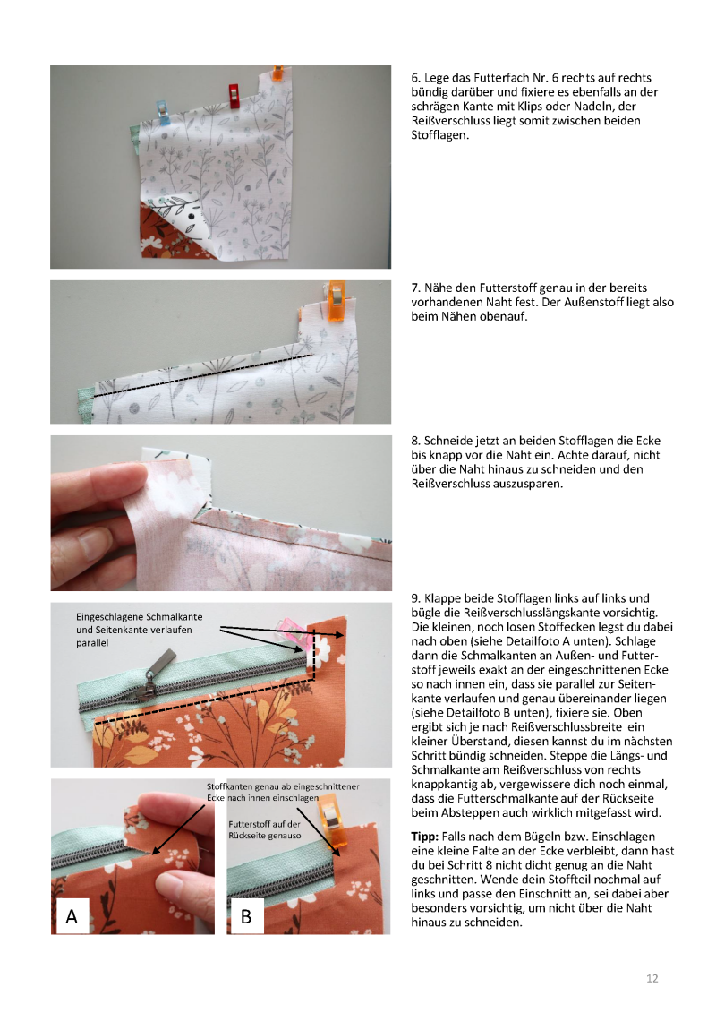 Für die Taschenfront stehen dir zwei ansprechende Varianten zur Auswahl: Reißverschlusssteckfächer für einen schlichten Look oder Reißverschlussflügelfächer – ideal für Näherinnen mit etwas Erfahrung. An der Verschlussklappe kannst du dich zwischen einem dekorativen Karabinerverschluss oder einem Druckknopf entscheiden – beide Optionen werden in der Anleitung detailliert gezeigt.