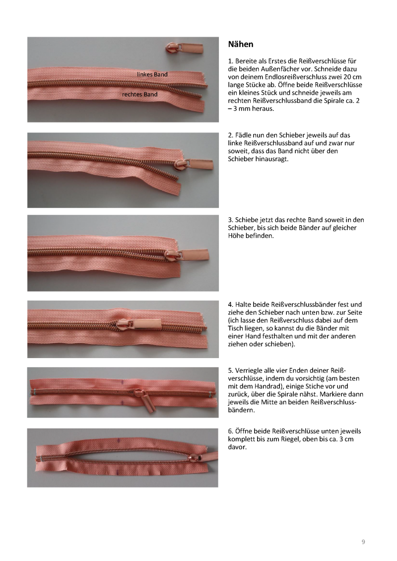 - Optional 15 cm Falzgummi oder normales Gummi, 50 cm Endlosreißverschluss je nach Innenfachwahl